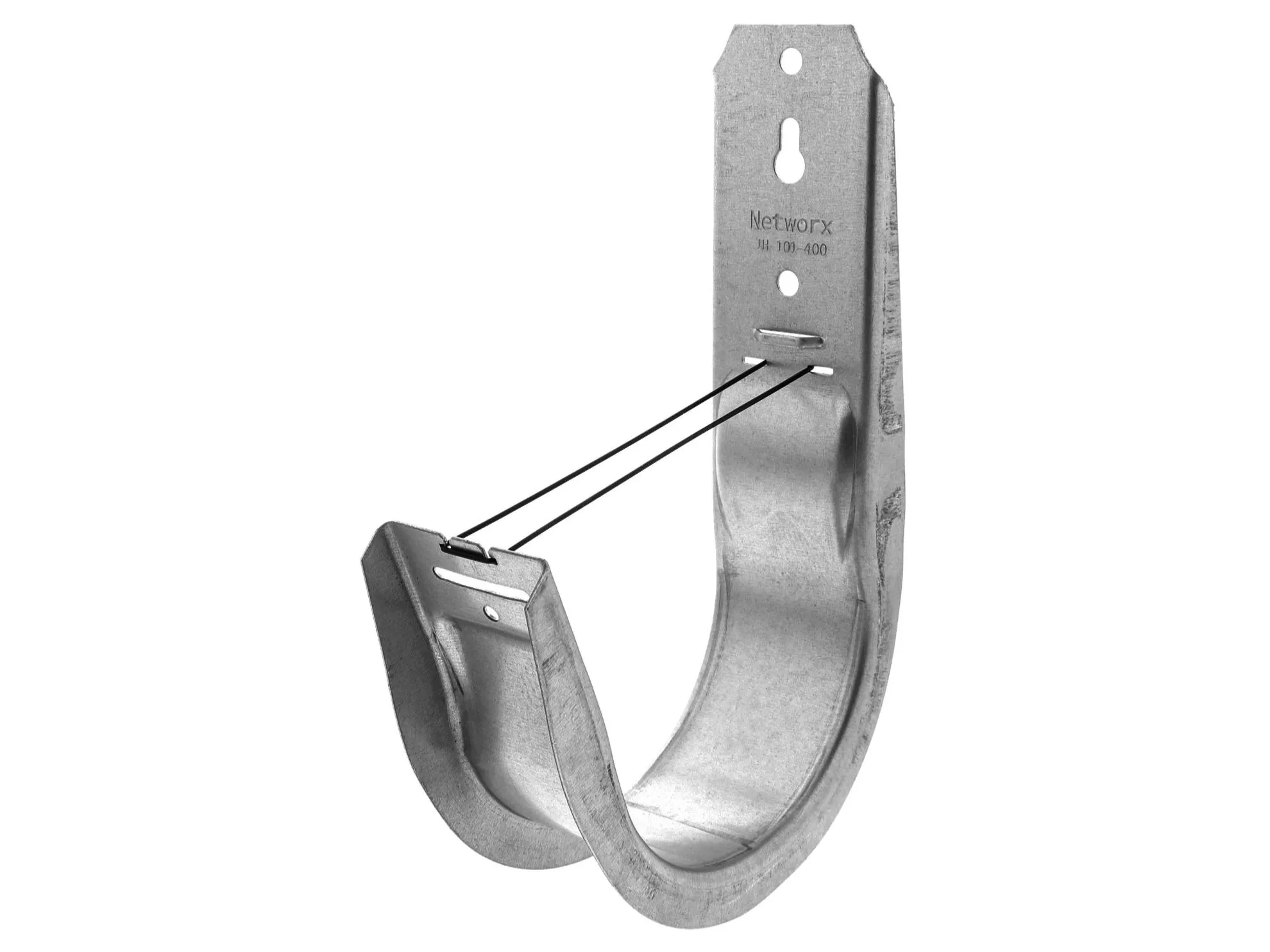 4 Inch J-Hooks from Networx® feature a galvanized steel, rust resistant build perfect for structured category cable, fiber optic cabling, and other low-volated cable applications.