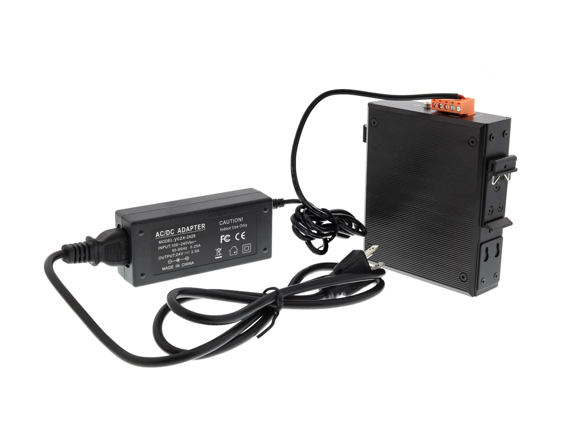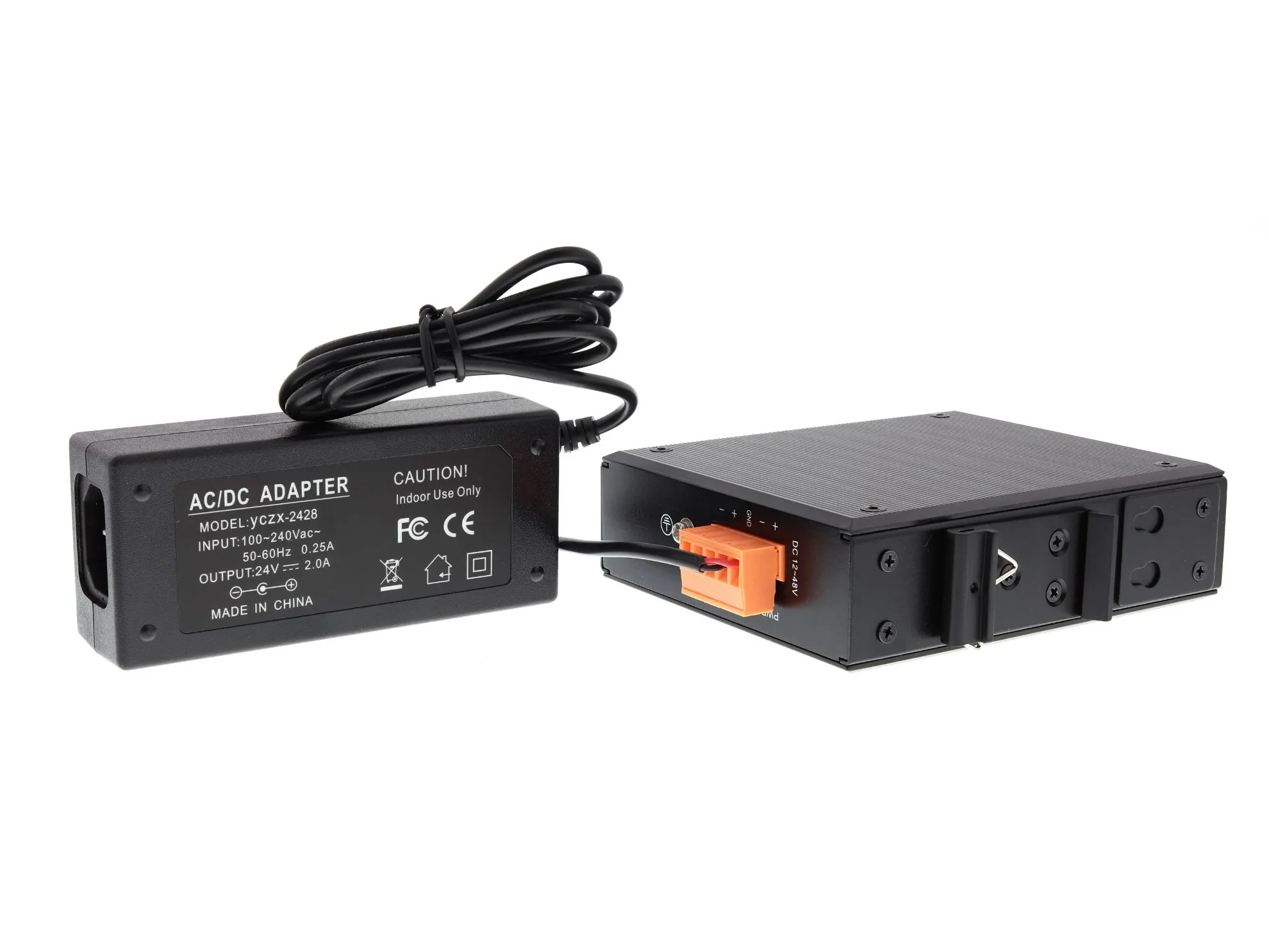 Designed from the ground up to deliver the power required by high-demand Industrial Media Converters. Input 100-240 Volts AC into this AC/DC Adapter and get the juices flowing into 24 Volts and 2 Amps of delicious DC power. Industrial Fiber Optic Media Converters are built to withstand harsh environments and will keep your network running at peak performance.