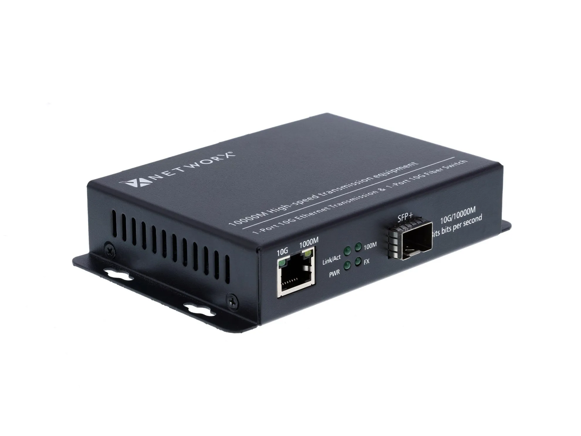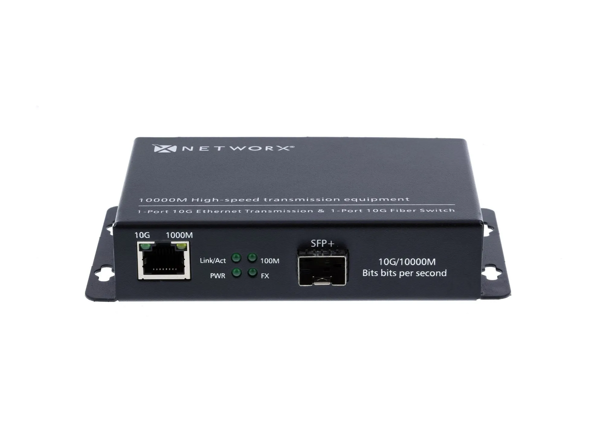 Push your network faster and further with a 10 Gig media converter from Networx®. Media converters are designed to adapt a signal from one type of media (copper ethernet) and convert it to another media (fiber optic). No longer will you be shackled by the slow speeds of 1 Gig network! This 10G fiber optic media converter allows you to expand your copper network over long distances. Looking for a specific fiber configuration? Look no further than the Networx® 10Gig fiber media converter! With an open SFP port, this media converter allows you to use most SFP transceivers so you can configure the 10 Gig media converter to your specific needs.