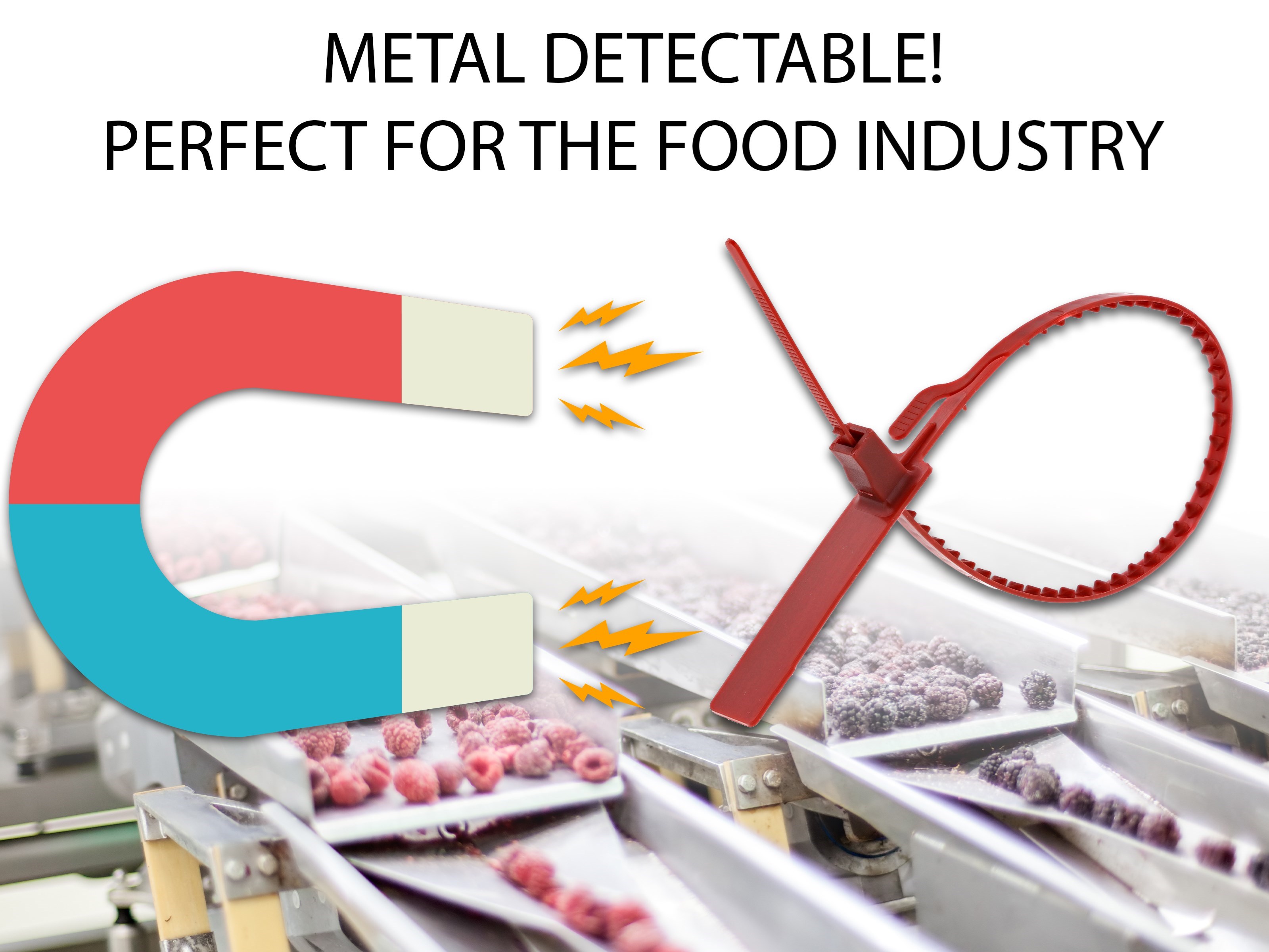 Metal Detectable security seals offer a traceable solution for workplaces where foreign objects left behind will cause serious issues. Made of high-density polypropylene and special metal materials, these tear-away security plastic seals have a breaking strength of up to 79 lbs, do not come with any markings, and are both metal detectable and x-ray detectable. To use, thread the end of the seal through the closure and into the area marked "enter" at the end of the seal and pull tight. They do not require additional tools like bolt or cable cutters to remove; pull the designated tab away from the seal to remove.