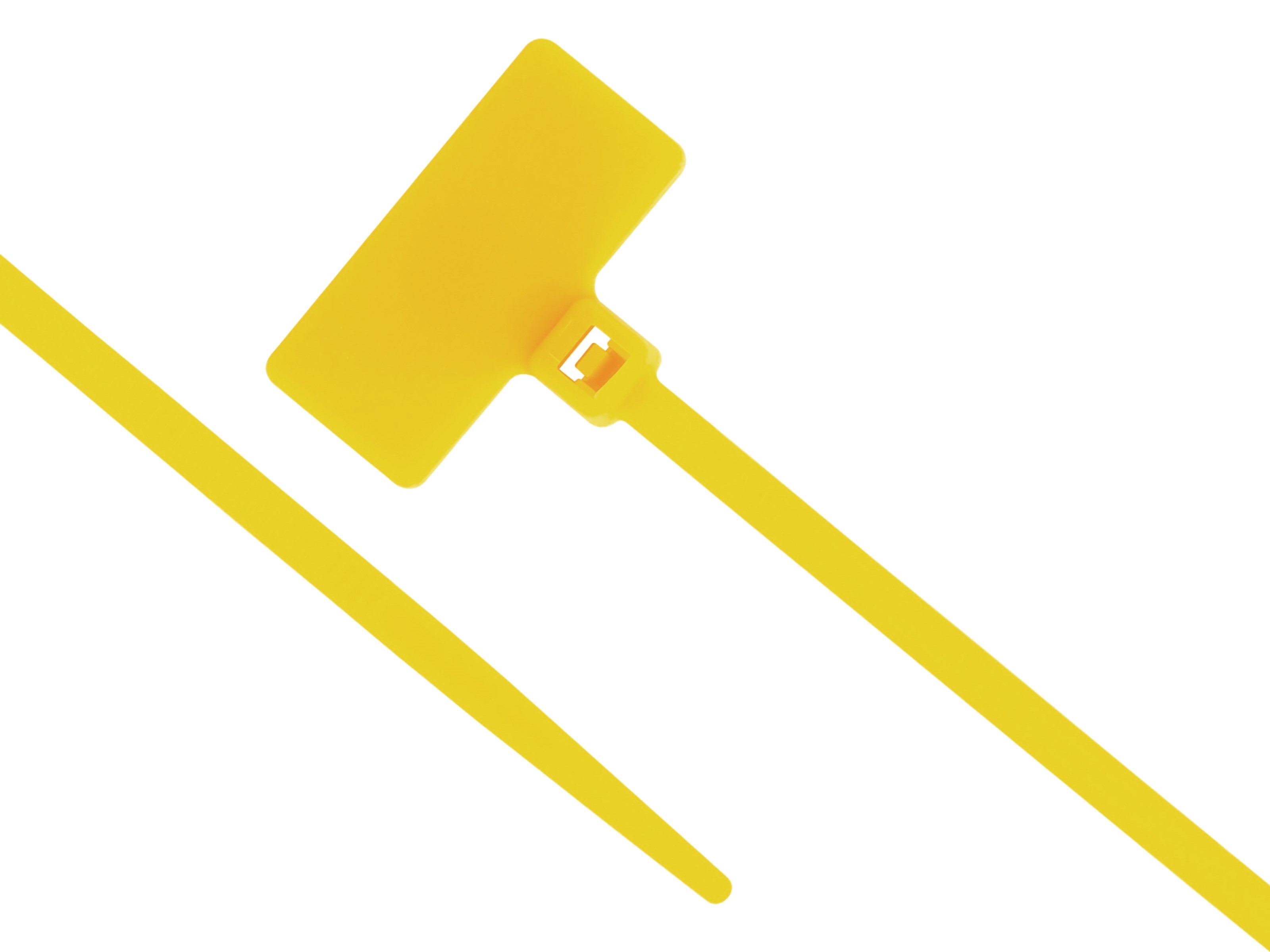 Introducing the 4 Inch Yellow Miniature ID Cable Tie with Outside Flag by RealGrip™. This versatile and durable cable tie is designed to help you organize and identify your cables with ease. Made from high-quality Nylon 6/6, these cable ties are perfect for general-purpose use and come in a vibrant yellow color for easy visibility.